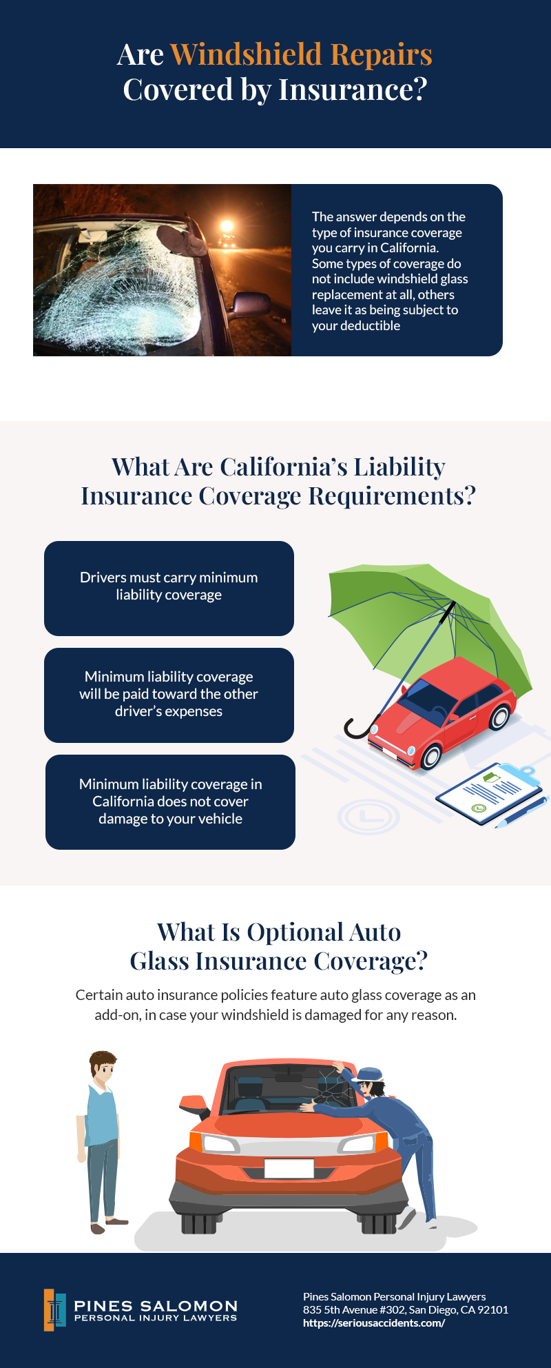 Minimum liability coverage in California does not cover damage to your vehicle, however, and will not cover auto glass repairs.