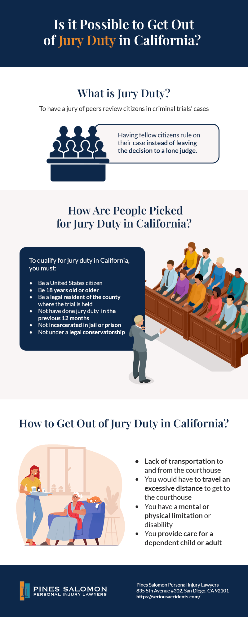 If you need to get out of jury duty, go through the proper steps with your local courthouse. If you have questions about how to get out of jury duty, talk to an experienced San Diego personal injury attorney with Pines Salomon Personal Injury Lawyers, for detailed advice.